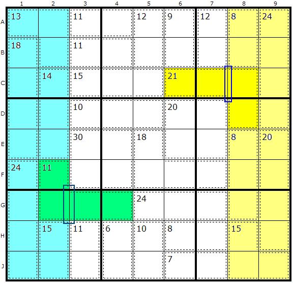 Jump to navigationJump to searchUsing the 45 rule, sometimes multiple cells are sticking out of the selected houses. When this happens, you can split the cage into 2 smaller cages.