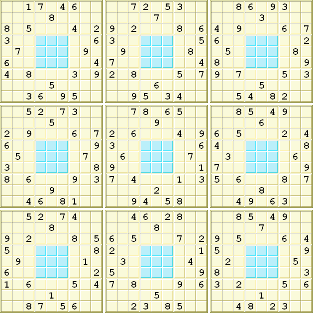 Jump to navigationJump to searchClueless is one of the Gattai Sudoku Variants that combines multiple Sudokus into a single puzzle.