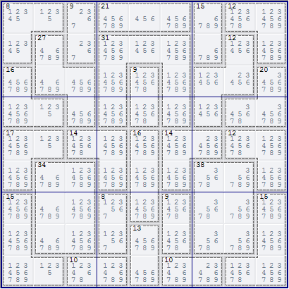 The following example is taken from Weekly Assassin 36. The 27/4 cage at r2c2 must be either {5679} or {4689}, and therefore must contain the digits 6 and 9. Both cells in the 9/2 cage at r1c3 can see all cells in the 27/4 cage. Therefore, the candidate 6 can be eliminated from r12c3, which must therefore contain the digits {27}.
