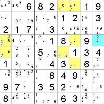 The following example shows a Finned Swordfish "in the columns" for the digit 7 is shown in yellow in the grid, with a fin located at r6c7.