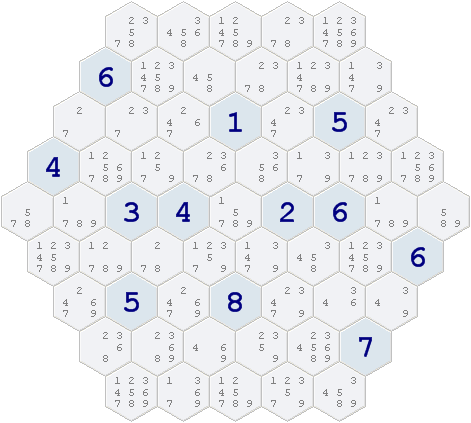 Jump to navigationJump to searchHanidoku is a Sudoku Variant which uses hexagonal cells. The image shows a Hanidoku example. Every horizontal, inclining diagonal and descending diagonal line must contain a consecutive series of digits. Because these lines are different in size, they do not all contain digits 1 through 9. Some may contain digits 1 through 5, others may contain digits 5 through 9. This adds a level of difficulty that you will not encounter in a regular Sudoku. Fortunately, there are no boxes that you have to take into account.
