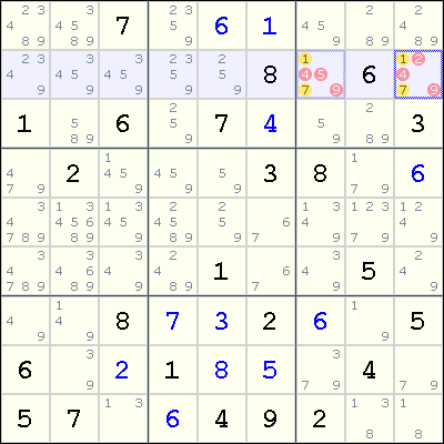 The following example shows a Hidden Pair in the second row, for the digits 1 and 7. The red candidates can be eliminated.