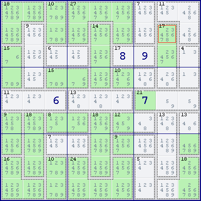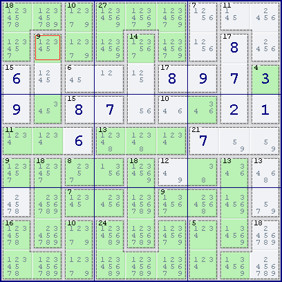 The possible cage combinations of the 17[3] cage in column 8 are {2,7,8} or {3,6,8} or {4,5,8} or {4,6,7}. However, in column 8, all cells that has 7 as a candidate are the cells in the 17[3] cage. Therefore, we can strike off the combinations {3,6,8} and {4,5,8}, leaving the combinations {2,7,8} or {4,6,7}. This implies that we can eliminate 3 and 5 from all cells in the cage.