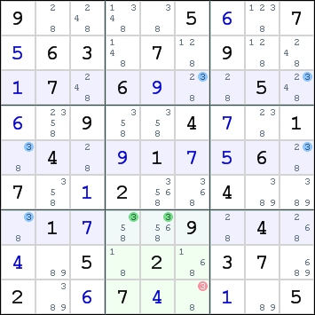 Sashimi Swordfish for digit 3 in rows 3,5,7 and columns 1,6,9 with a fin in box 8.
