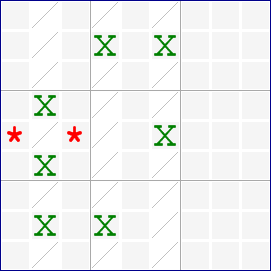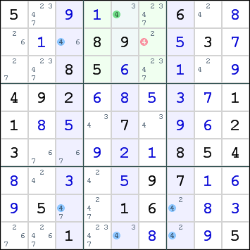 When there are 2 secondary lines present in the box with the fin, upto 4 candidates can be eliminated. As a result, all remaining candidates in this box will be located on a single row or column (row 1 in the diagram). This triggers a Locked Candidates move that causes additional eliminations on this line.