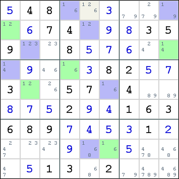 It is easy to see that it would be impossible for all blue cells to contain digit 1. There are 2 blue cells in row 1, box 2 and column 5. Because some blue cells are invalid, we can declare all blue cells unsuitable for digit 1.