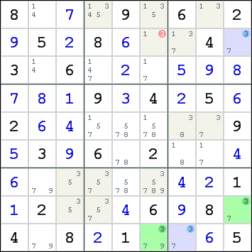All the candidates for digit 3 are highlighted. When a row, column or box contains only 2 candidates for a digit, one of them must be true and the other must be false. These candidates have a strong link. In coloring terminology, these candidates form a conjugate pair. We can use colors to help us remember which candidates must be true or false simultaneously. In the example, green and blue colors have been applied. Notice that row 9, column 9 and box 9 all have 2 candidates for digit 3, which now have opposite colors.